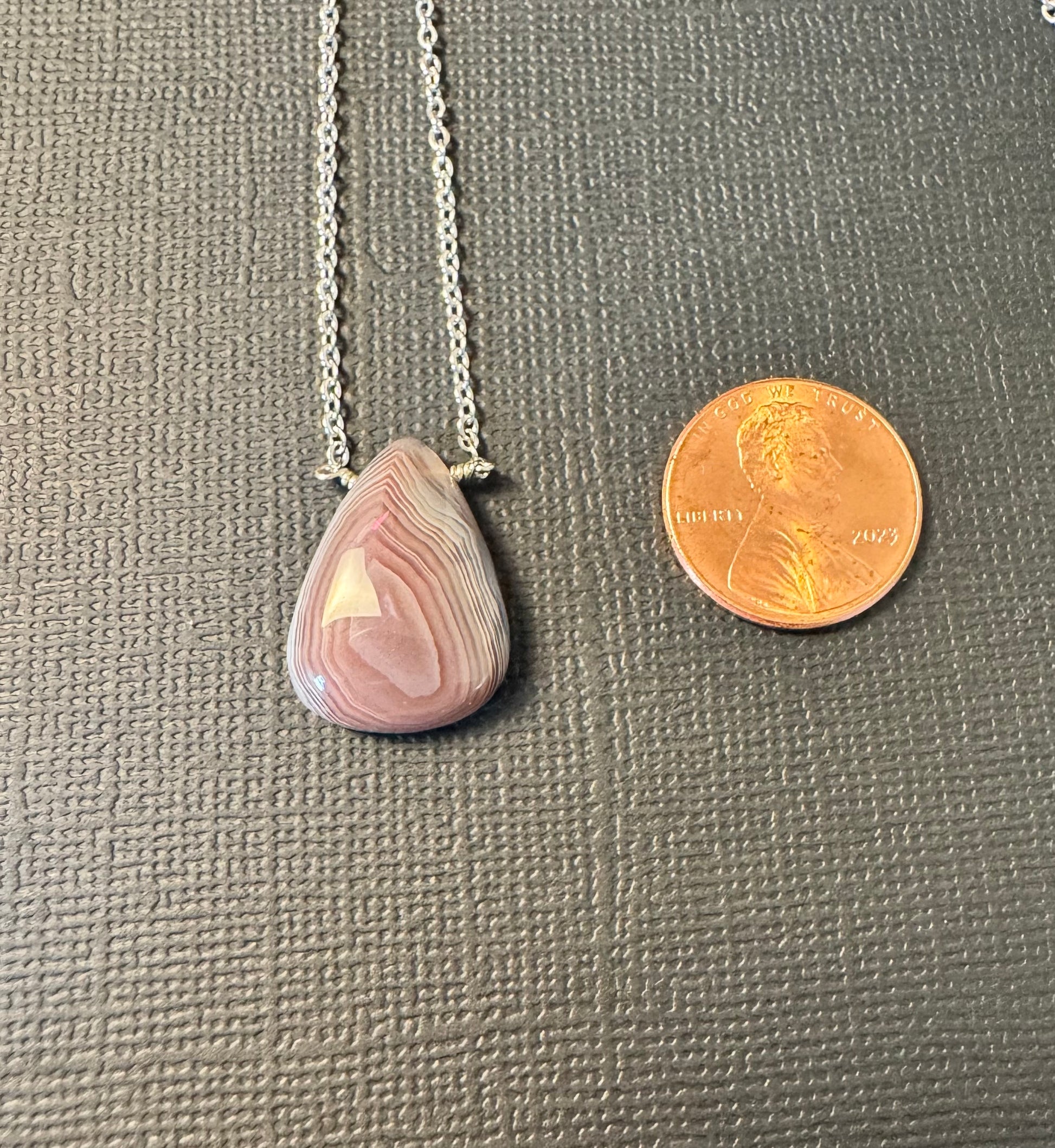 Botswana Agate is known as a soothing and nurturing stone, often associated with emotional healing and stability. Stainless steel chain, 17 inches + 2-inch extender.