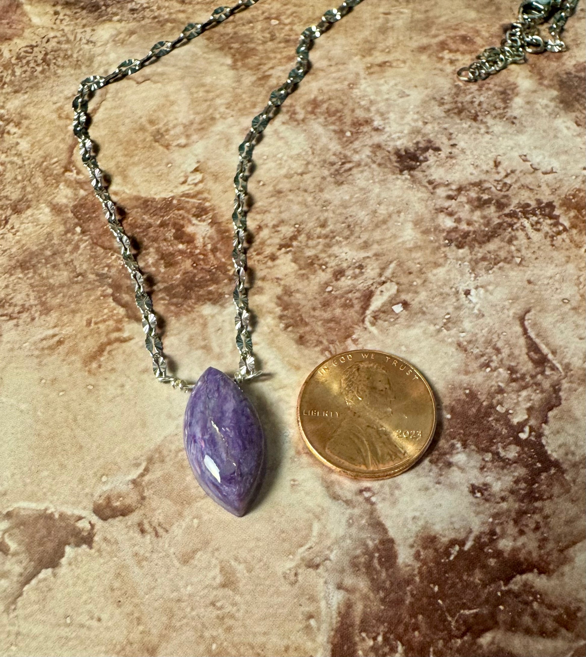 This lovely lilac stone is found only in the Chara River area of Russia. It is sometimes called the “Stone of Transformation” and is believed to help change negative emotions into positive ones, encourages positive self-esteem and self image. Stainless steel chain. 17 inches + extender.
