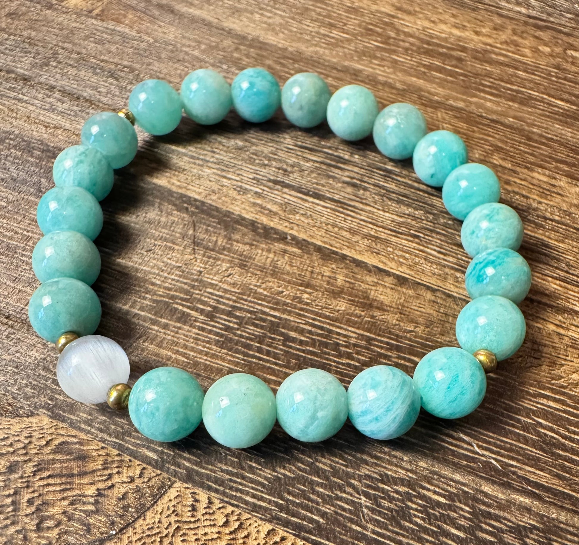 8mm AA-grade Russian Amazonite with a Selenite focal stone and antique gold accents.